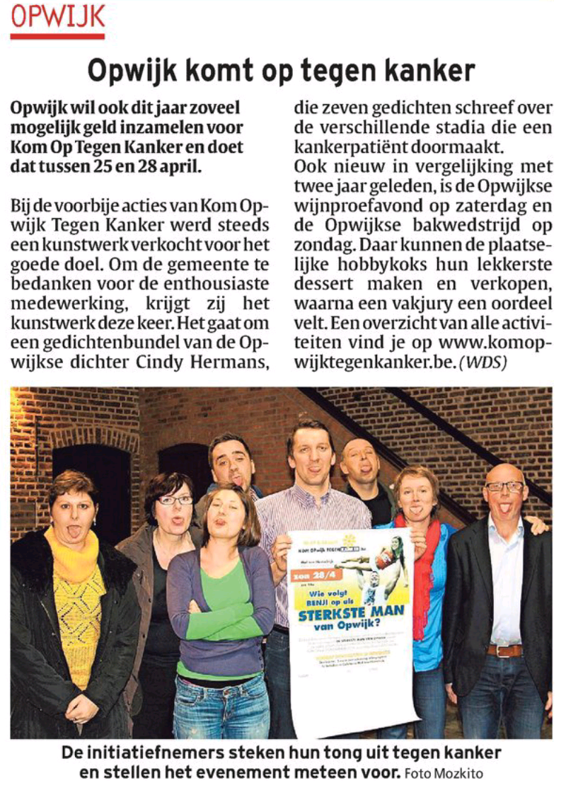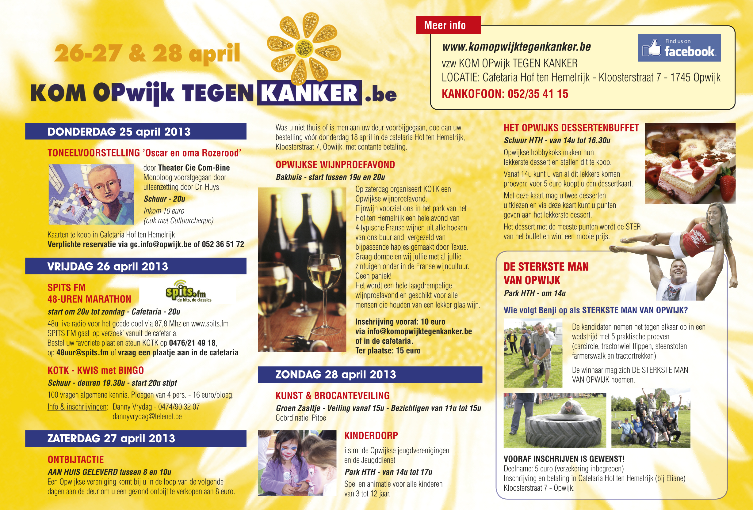 Het Kom Opwijk Tegen Kanker-weekend dat doorging van donderdag 25 april tot en met zondag 28 april bracht alweer een recordopbrengst op van 45.414 euro. De verschillende festiviteiten brachten mede dankzij het mooie weer veel volk op de been. Alvast bedankt aan alle verenigingen en alle medewerkers!!