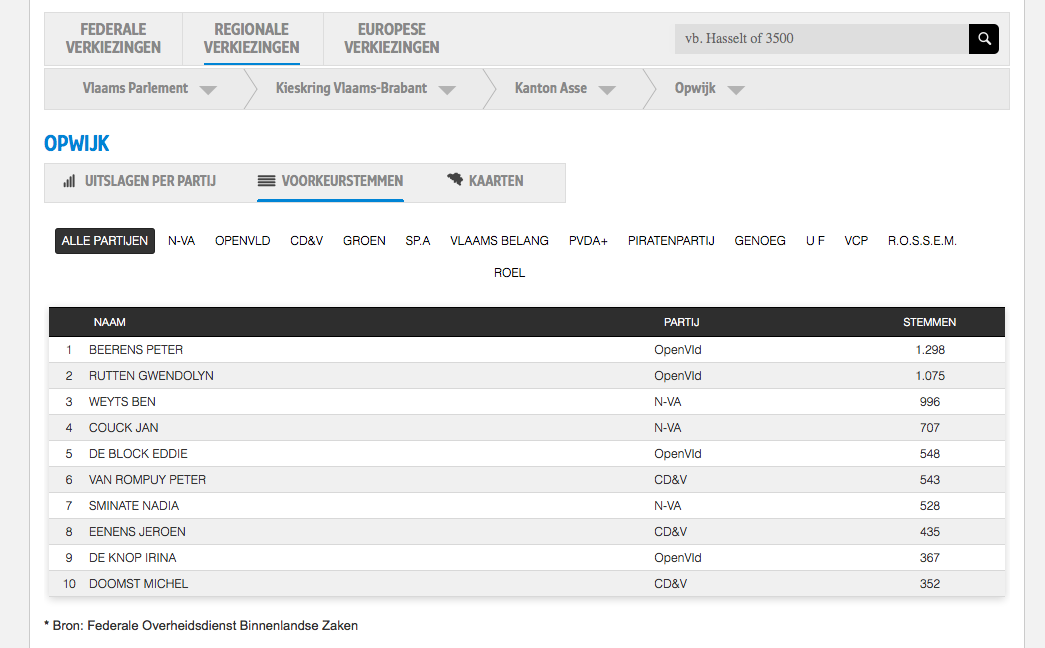 Als ik de resultaten dan eens verder bekijk, dan blijkt dat ik van alle kandidaten op de lijst van het Vlaams Parlement (over de partijgrenzen heen) in Opwijk de meeste stemmen gekregen heb, nl. 2198 voorkeurstemmen. Waarvoor nogmaals dank Opwijkenaars!