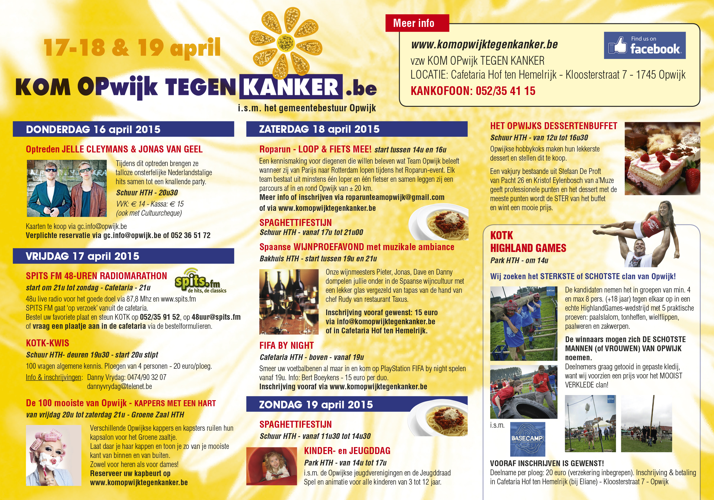 Tijdens het weekend van 16, 17, 18 en 19 april 2015 gaat voor de 9de maal Kom Opwijk Tegen Kanker door. Alle festiviteiten zullen dit weekend plaats hebben op het domein van het GC Hof ten Hemelrijk. Er is voor ieder wat wils! Zo is er een kwis, muziekmarathon, kapsalon, spaghettifestijn, wijnproef, Fifa-toernooi, fuif, bakwedstrijd, kinderdorp en wedstrijd “Sterkste ploeg van Opwijk”.