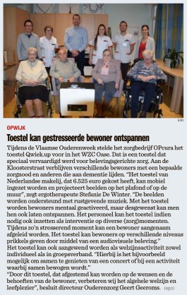 Welzijnsvereniging OPcura exploiteert verschillende woonzorgvoorzieningen zoals een woonzorgcentrum, dagverzorgingscentrum en serviceflats. In woonzorgcentrum “De Oase” verblijven heel wat bewoners met een bepaalde zorgnood en bewoners die lijden aan dementie. Voor deze bewoners werd er recentelijk het toestel “Qwiek.up” aangekocht. Dit toestel is een zorgondersteunend product dat speciaal gemaakt werd voor de toepassing van belevingsgerichte zorg. Dit toestel kan bewoners op verschillende niveaus prikkels geven, door middel van een audiovisuele beleving in hun eigen omgeving.